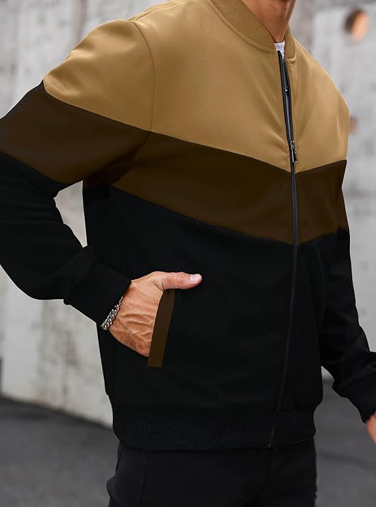 Men’s Color-Block Zip-Up Bomber Jacket in Camel, Olive & Black