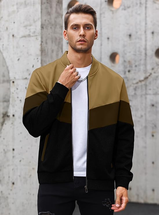 Make a bold statement with this Men’s Color-Block Zip-Up Bomber Jacket, designed for those who value modern streetwear with a stylish edge. Featuring an eye-catching combination of camel, olive, and black panels, this jacket adds dimension and attitude to your casual wardrobe.
